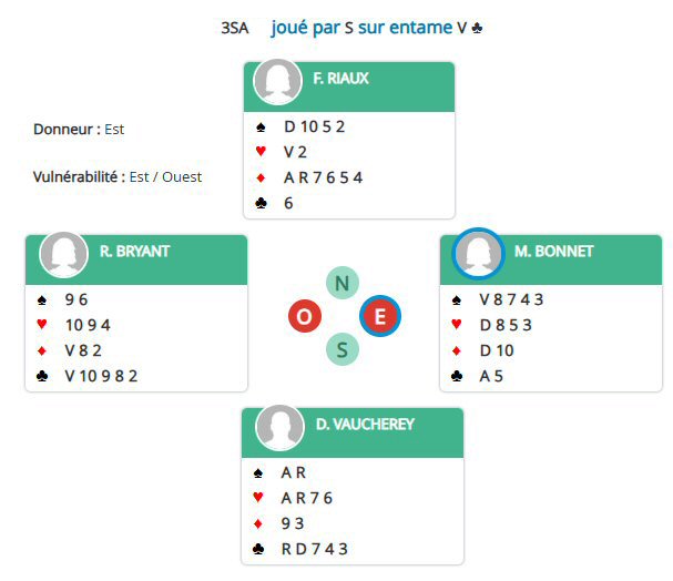Quelle que soit la relance d’Est, Sud prend la main. Il doit, dans un premier temps, débloquer la couleur à ♠ (sait-on jamais !). Il donne maintenant un coup à blanc à ♦, seule possibilité, en cas de partage favorable de la couleur, d’y gagner des levées. Reprenant ensuite la main sur une deuxième relance de ses adversaires, il jouera pour As, Roi de ♦ et les ♦ affranchis grâce à leur répartition sympathique. 11 levées au final.