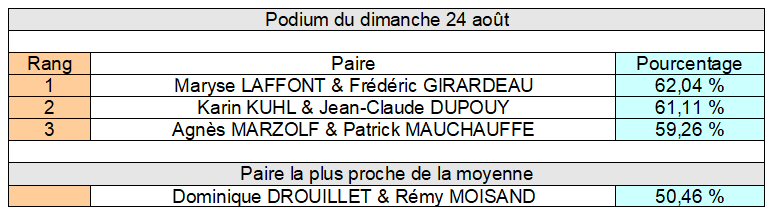 Dominique DROUILLET & Rémy MOISAND, avec 50,46,%, joueront gratuitement le prochain tournoi, dimanche 31 août à 20 heures 12.