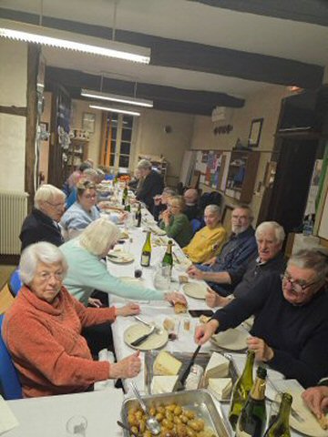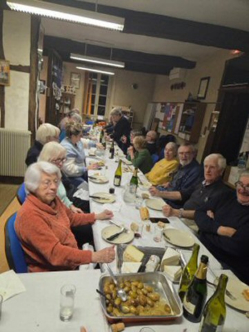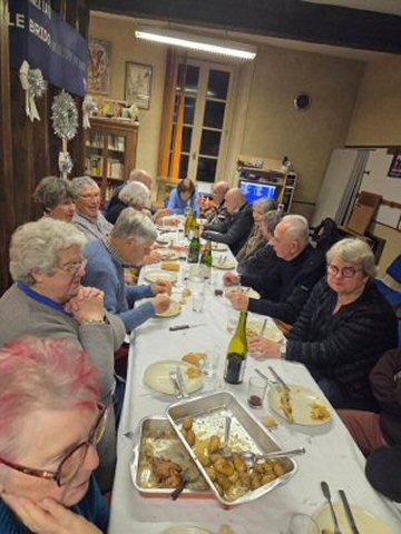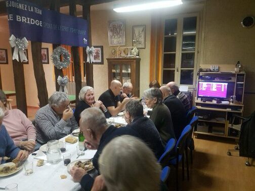 Surprenante façon de fêter le « Dry January », le club avait organisé hier le « Venez dîner » de janvier en faisant débuter, à l’issue du tournoi traditionnel, le repas qui suivait, par la dégustation de quelques bulles, précédant la consommation d’un appétissant foie gras et  de rôtis de chapons farcis, agrémentés de pommes de terre savoureuses et de petits légumes joliment présentés,  auxquels succédaient quelques plateaux de fromages , le repas se terminant par la dégustation de galettes des rois, le tout, accompagné, comme il se doit, de liquides variés peu en adéquation avec cette période d’abstinence.
