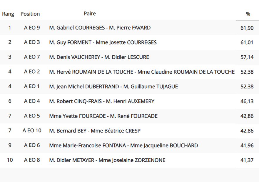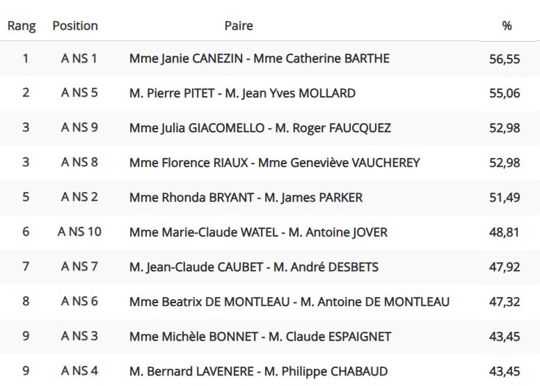 Disputé à l’ancienne, du fait d’une coupure locale de réseau Internet et de l’absence de wifi, avec transcription, au stylo bille, des résultats sur fiches ambulantes papier et saisie ultérieure sur ordinateur, il s’est traduit par les classements par ligne ci-dessous :